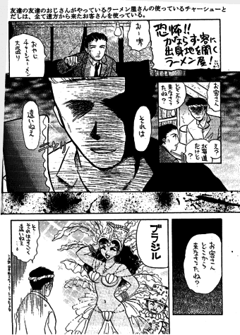 近所のラーメン屋さんでスープのだしに野良猫、野良犬を使っていた。また、中部地区には「すがやき」と言うチェーン店のラーメン屋があり、そこのスープは白いスープなのですが、そのだし汁に白蛇を使っており、友人の知人がバイトしていた時に鍋を眺めたら白蛇が混じっていたとか…。